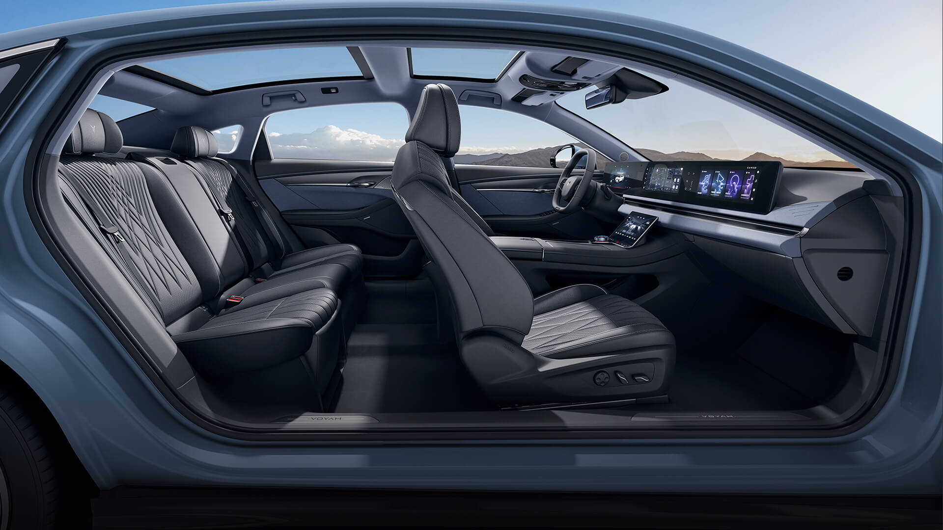 Voyah Passion si distingue per il suo profilo elegante e sportivo. La silhouette fluida, le maniglie a scomparsa e la firma luminosa a LED a tutta larghezza esprimono raffinatezza e modernità. Ogni dettaglio, dalla griglia frontale chiusa ai cerchi aerodinamici, è studiato per ridurre la resistenza all’aria e migliorare l’efficienza. Con oltre 5 metri di lunghezza, Passion trasmette presenza e proporzioni armoniose tipiche delle grandi berline di lusso.